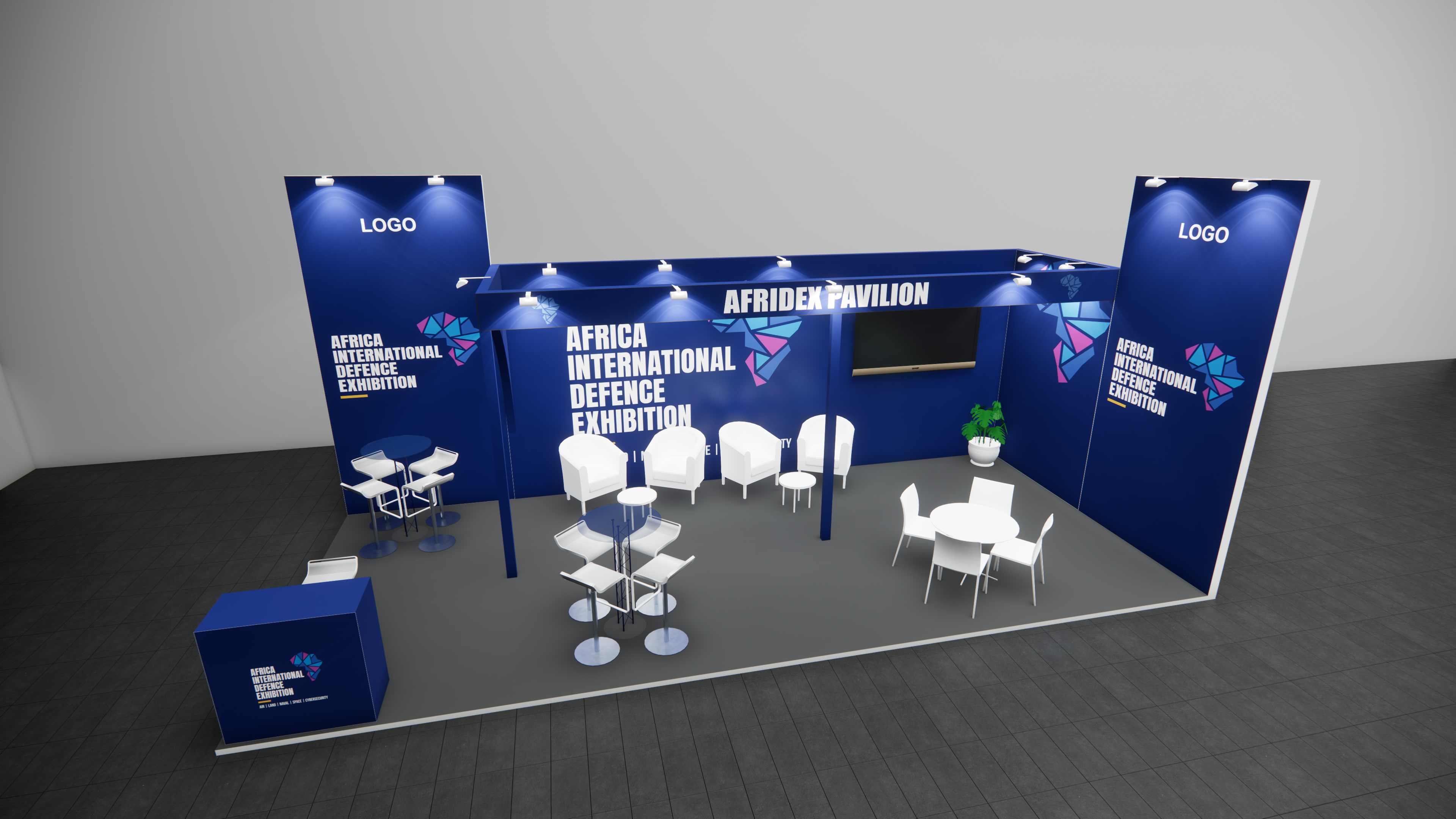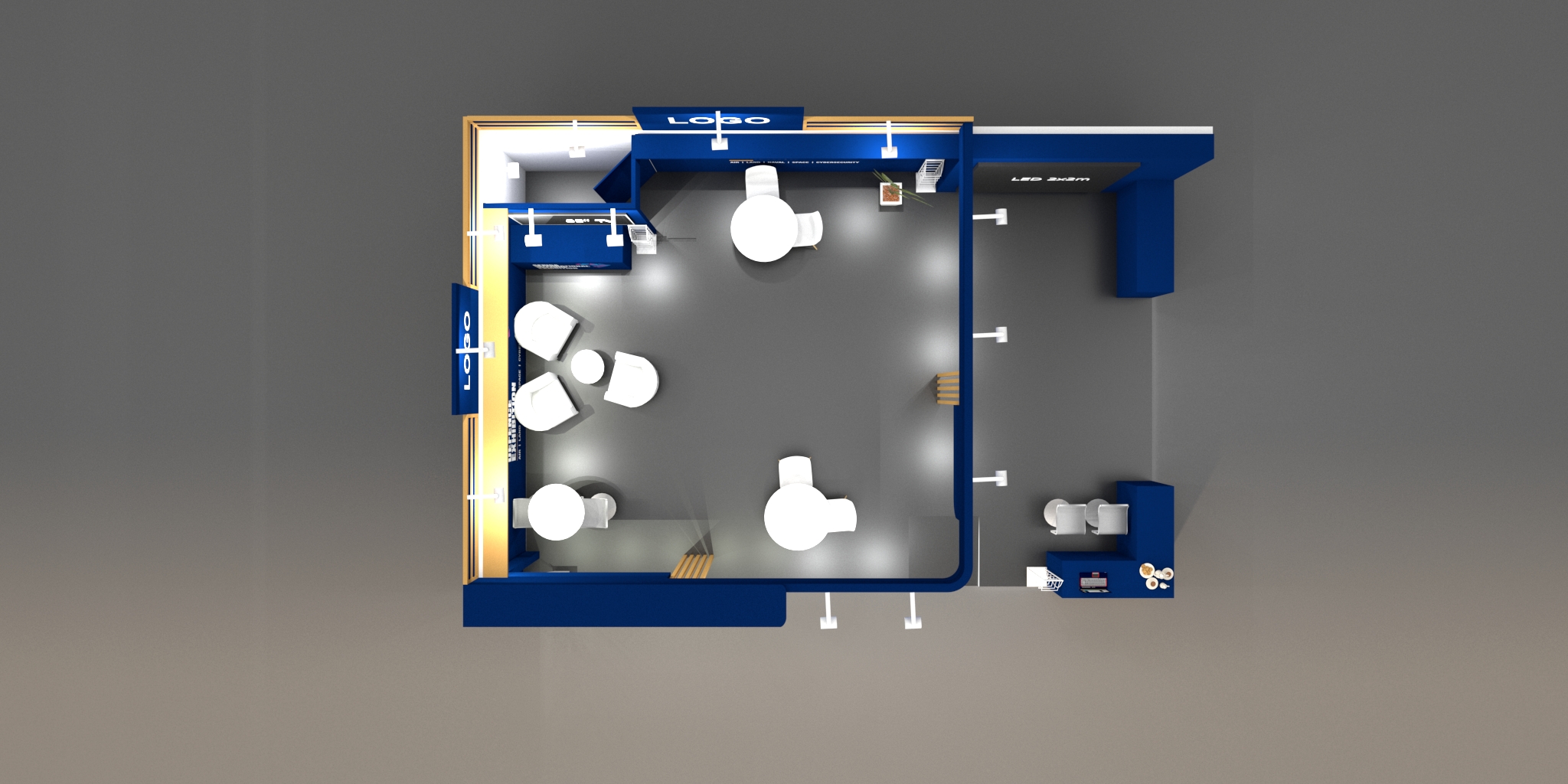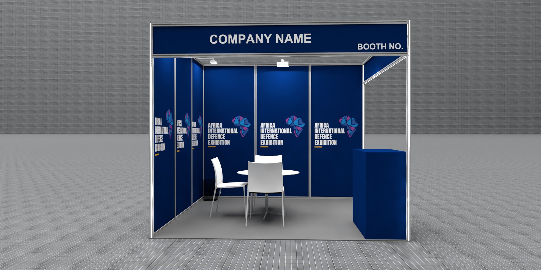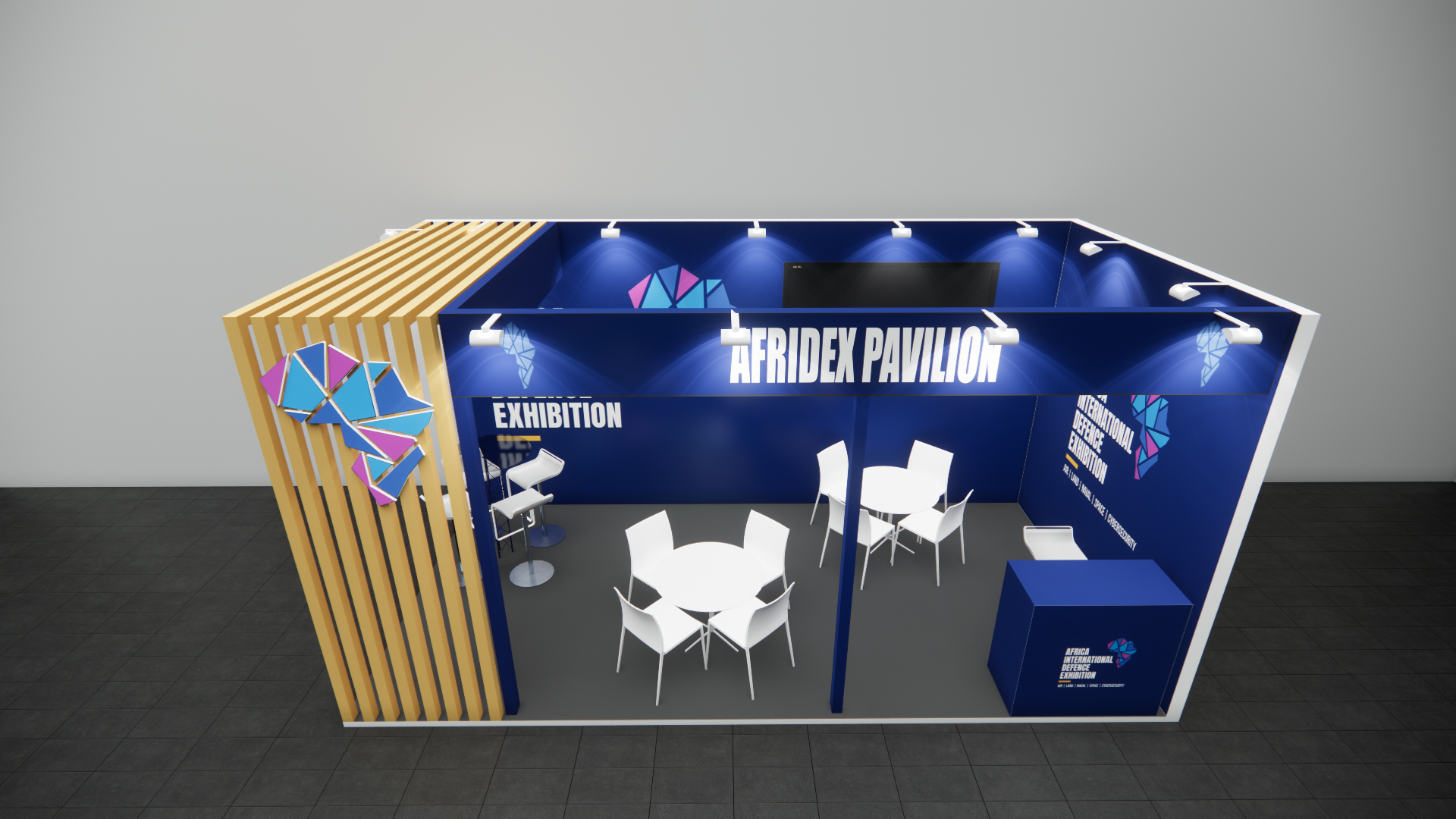 - Branded seamless walls with lit maxima square poles
