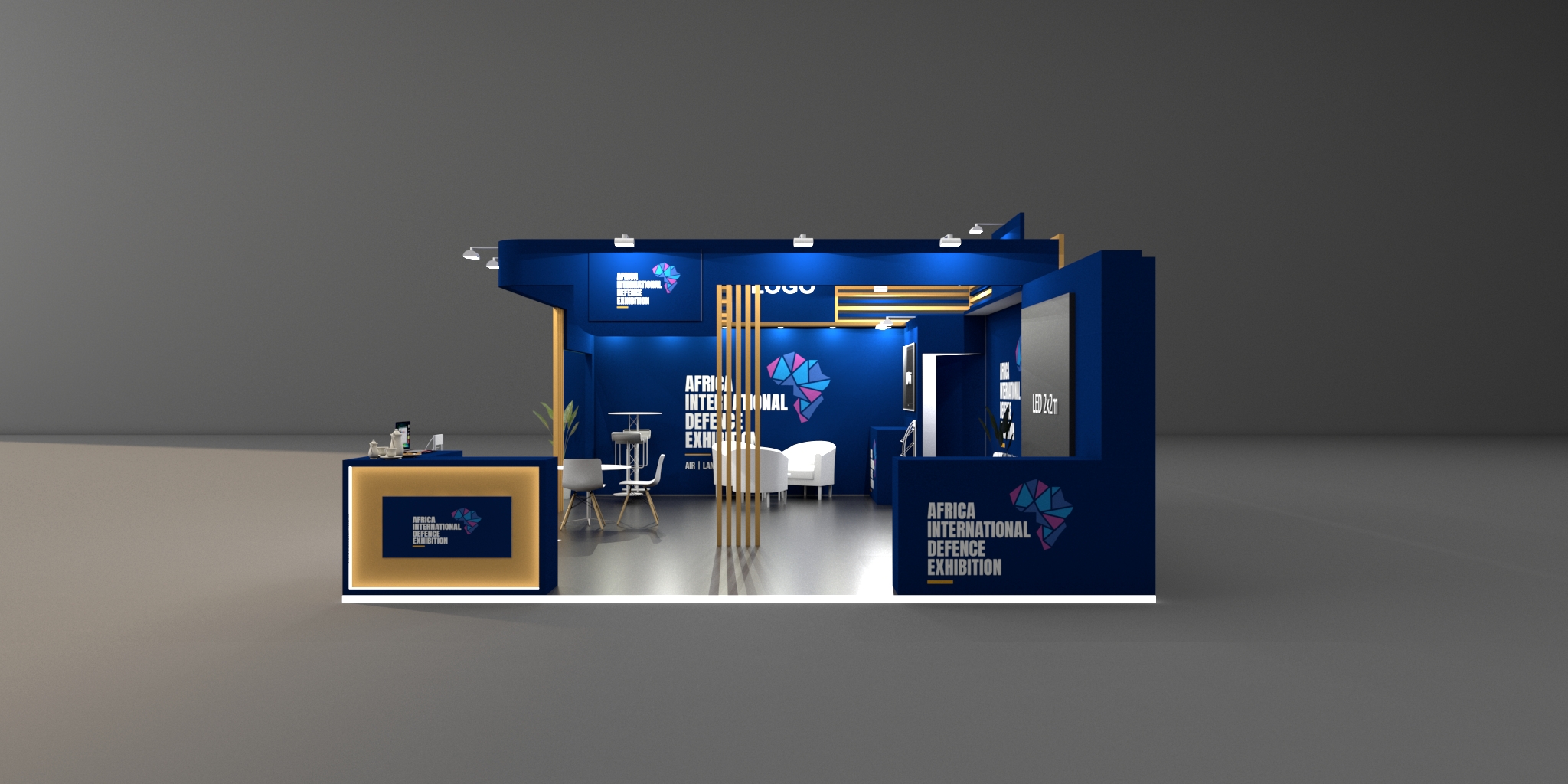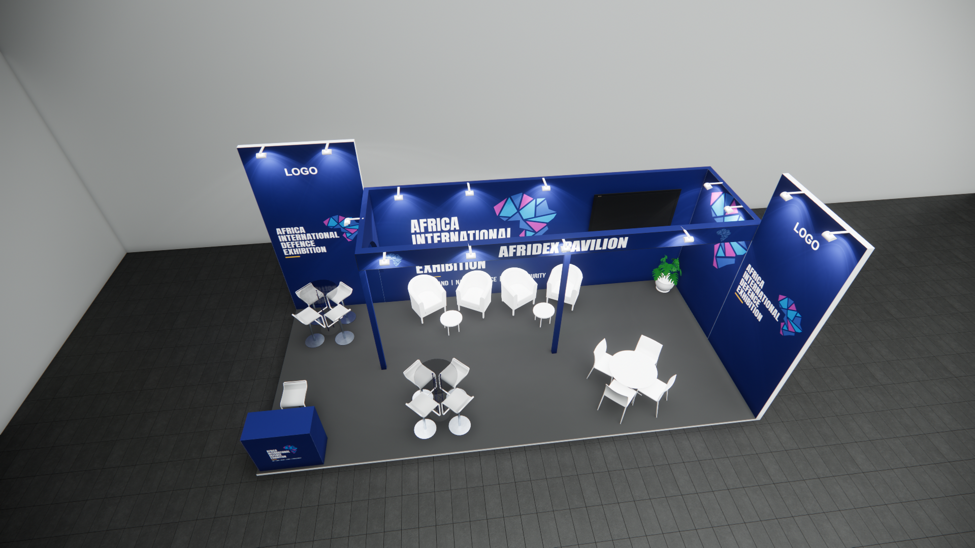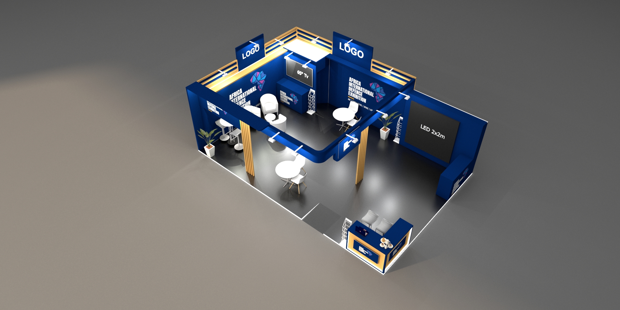 - Branded seamless walls with lit maxima square poles